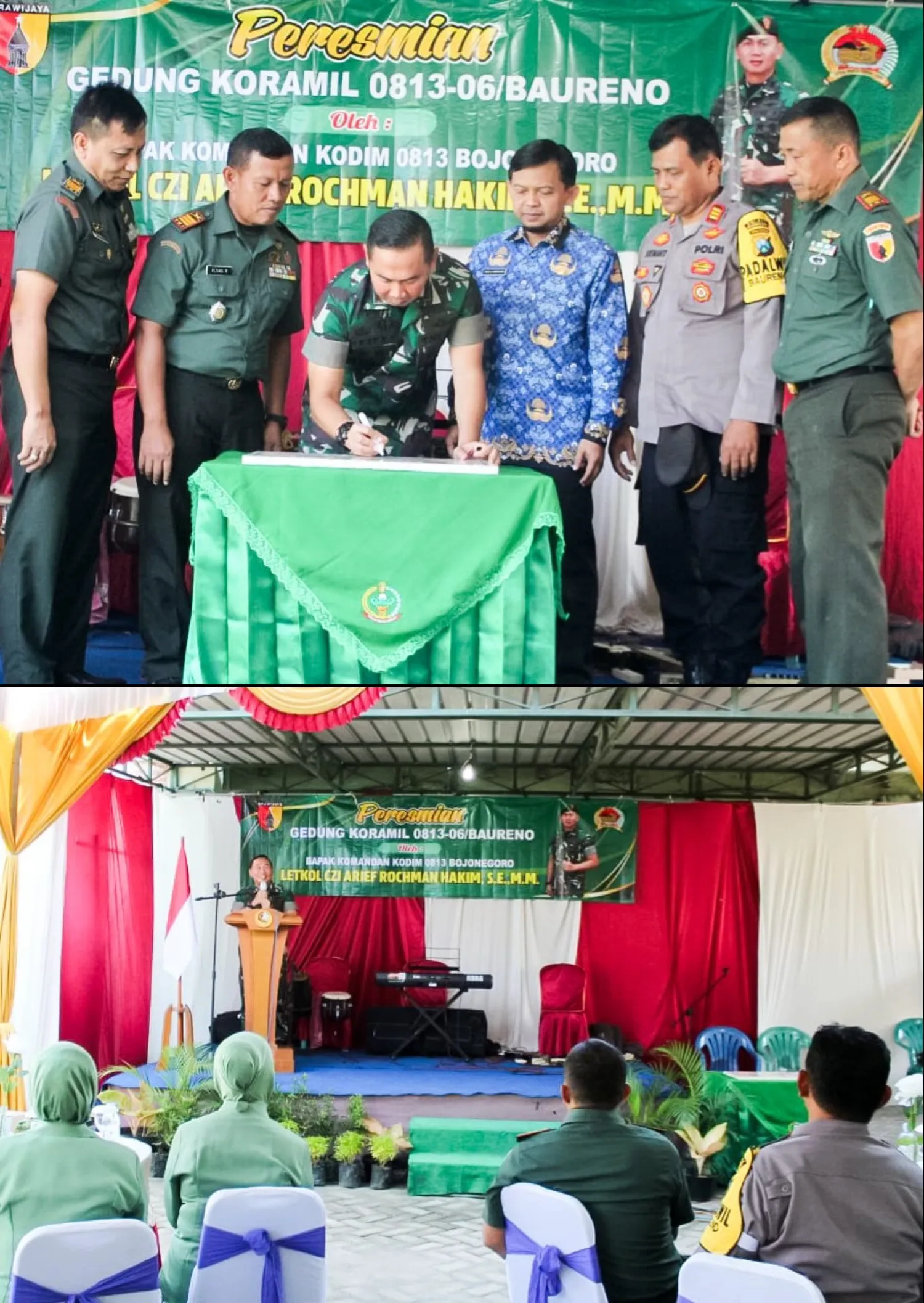 ZR BOJONEGORO, – Komandan Kodim (Dandim) 0813 Bojonegoro Letnan Kolonel Czi Arief Rochman Hakim, SE., MM., meresmikan bangunan baru kantor Markas Koramil 06/Baureno. Peresmian kantor yang terletak di Jalan Raya Bojonegoro – Babat turut Desa/Kecamatan Baureno tersebut, ditandai dengan penandatanganan prasasti, Rabu (19/6/2024).
