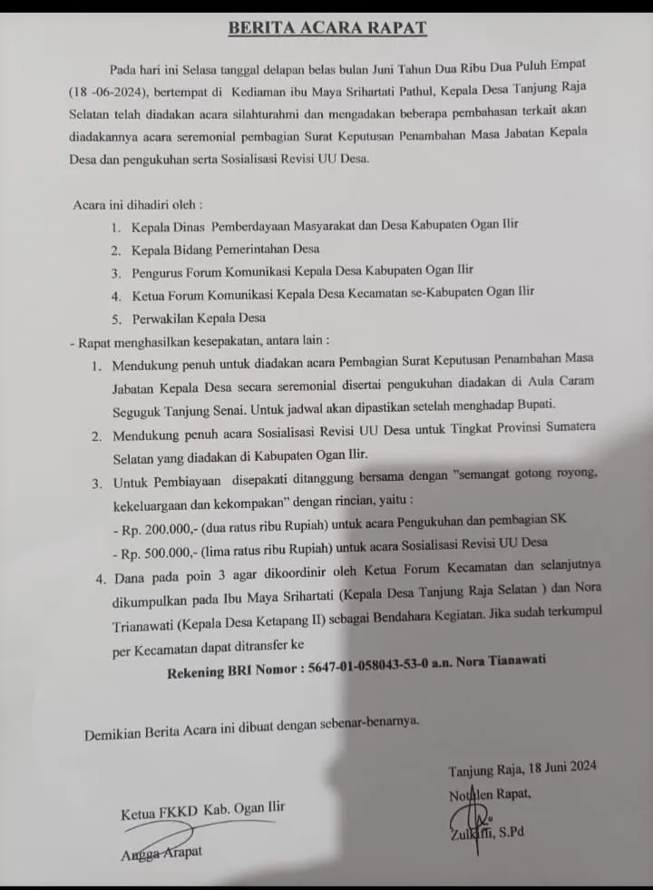 ZR Ogan Ilir,–Jabatan Kepala Desa secara resmi di perpanjang dari enam tahun menjadi delapan tahun setelah diberlakukannya Undang Undang Desa Nomor 3 Tahun 2024.akan tetapi pengukuhan jabatan Kepala Desa di Kabupaten Ogan Ilir (OI) tersebut di duga di manfaatkan,Di sinyalir menjadi ajang Pungutan liar (Pungli) Sebesar Rp.700 ribu.