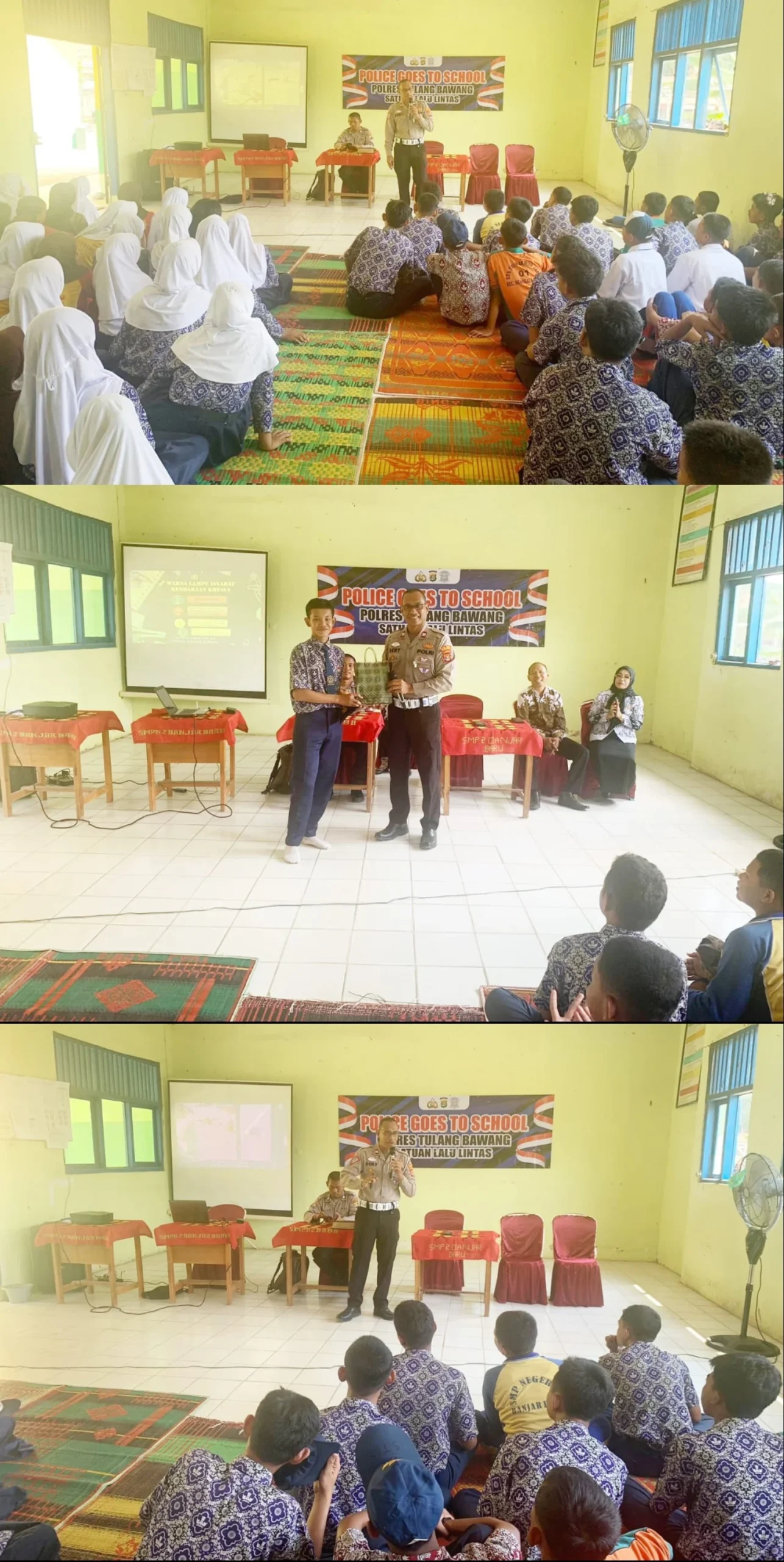 “Hari ini, petugas kami yang dipimpin langsung oleh PS. Kanit Kamsel Sat Lantas, Aiptu Deny Ertanto bersama dengan tiga personel menggelar kegiatan Police Goes To School atau Polisi Masuk ke Sekolah di SMP Negeri 2 Banjar Baru, Kampung Bawang Tirto Mulyo,” kata Kasat Lantas, AKP Khoirul Bahri, SH, MH, mewakili Kapolres Tulang Bawang, AKBP James H Hutajulu, SIK, SH, MH, MIK.