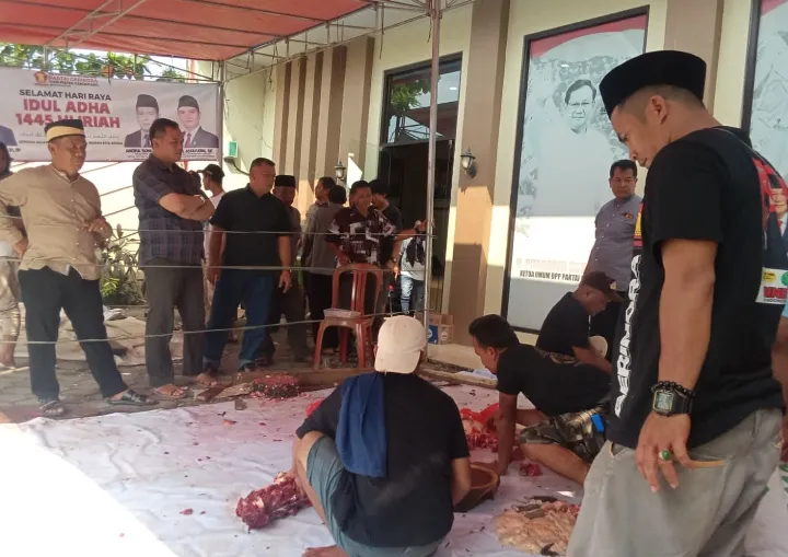 ZR Kabupaten Tangerang,-Dewan Pempinan Cabang ( DPC ) Partai Gerindra Kabupaten Tangerang di momen hari raya Idul Adha 1445 Hijriah 2024 seperti Rutinitas tiap tahunya melaksanakan pemotongan Qurban Sapi sebanyak 3 ekor bertempat di DPC Partai Gerindra Desa Margasari Kecamatan Tigaraksa Kabupaten Tangeang Banten , Senin 17 Juni 2024.
