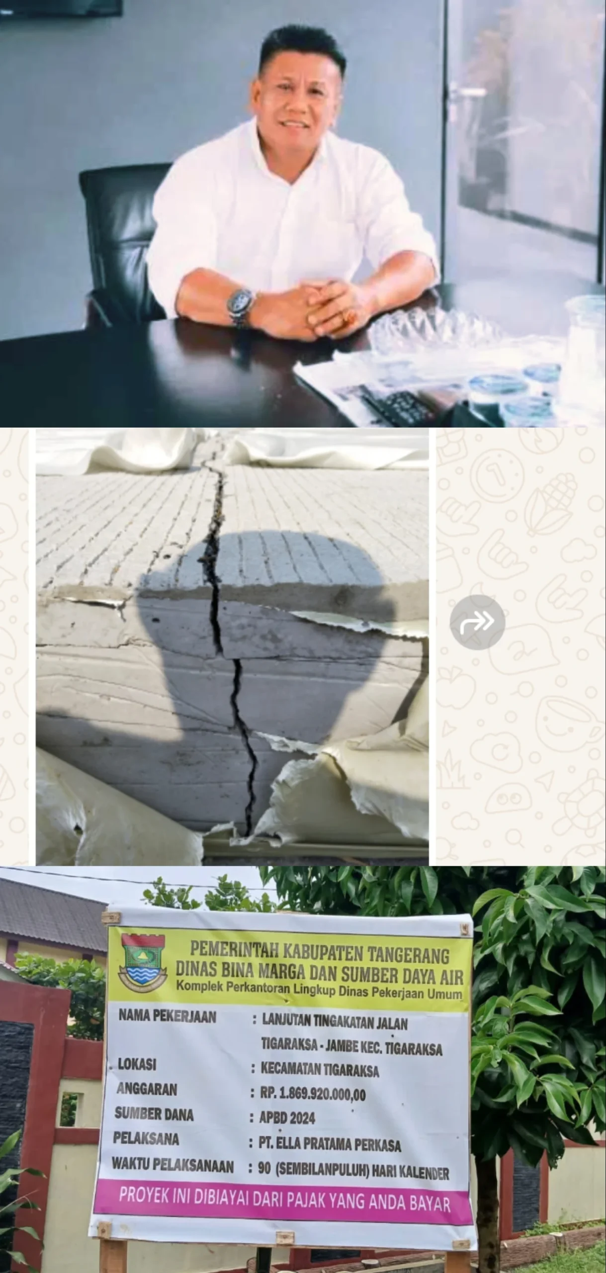 Proyek yang berasal dari APBD Kabupaten Tangerang , melalui DBSMDA , dengan anggaran Rp. 1.869,920,000,00 , Sumber dana APBD 2024, Pelaksana P.T. Elia Pratama Perkasa , waktu Pelaksanan 90 hari ( Kalender ) diduga asal jadi .