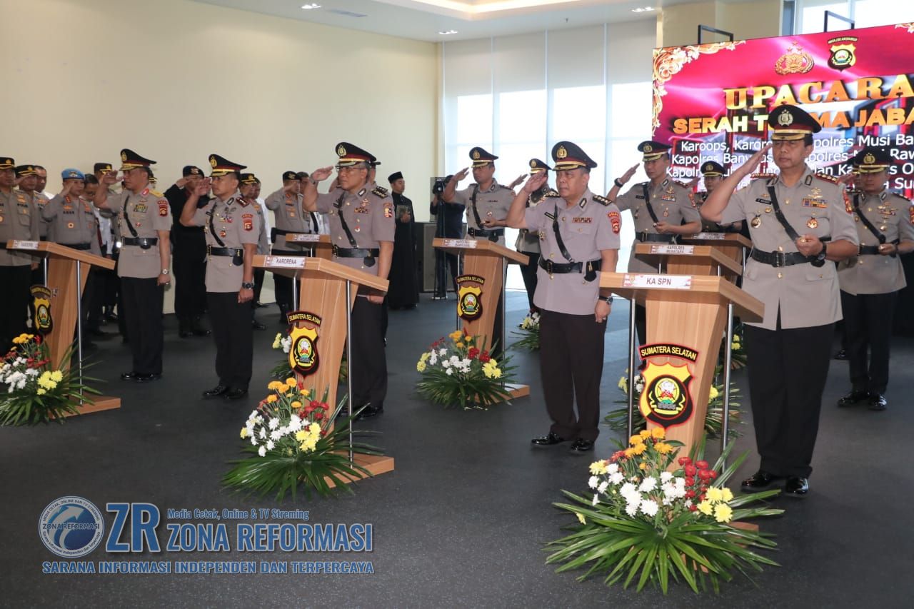 Adapun pejabat yang diserah terima kan kali ini yaitu,KA SPN Polda Sumsel Kombes Pol Tulus Ikhlas SH,MH kepada Kombes Pol Slamet Widodo SIK yang sebelumnya menjabat Kabag Prodok Ro PID Divisi humas Polri, sedangkan pejabat lama mendapat tugas Widyaiswara muda Sespimti Sespim lemdiklat Polri,Karorena Polda Sumsel Kombes Pol Agus Santosa SH,SIK mendapat tugas baru selaku Kabagren Rorenmin Lemdiklat Polri,jabatannya digantikan Kombes Pol Toto Wibowo,SH MH yang sebelumnya menjabat dosen utama STIK lemdiklat Polri,selanjutnya Jabatan Kaŕo Ops Polda Sumsel dari Brigjen Pol Drs Kamaruddin MSI yang mendapat promosi penugasan pada lemhanas Polri digantikan Kombes Pol Reeza Herasbudi,SIK,MM yang sebelumnya menjabat AKM bidang Brimob Korbrimob Polri Dikreg XLIX Sesko TNI.TA.2022