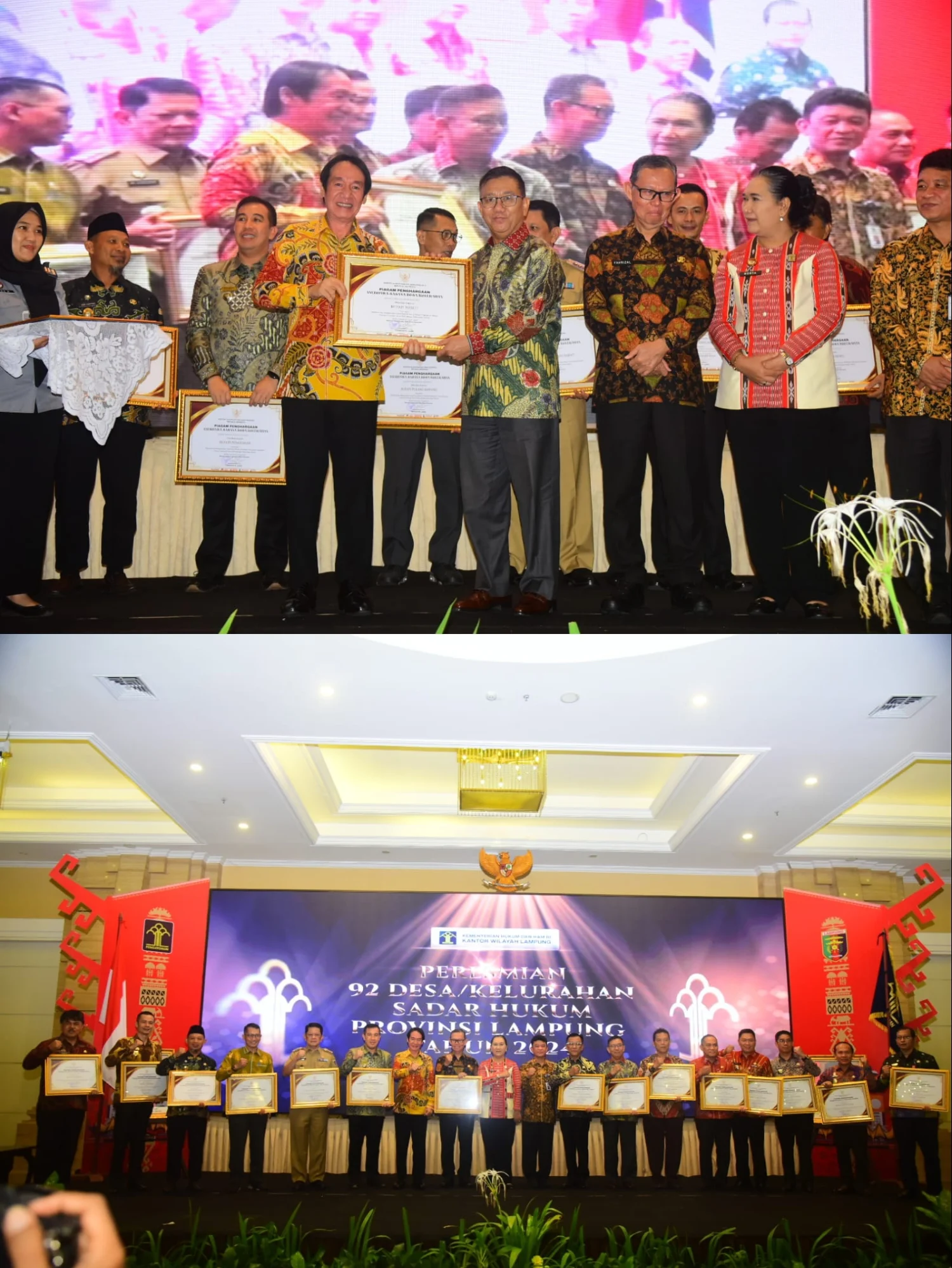 Penghargaan diterima Sekretaris Daerah Provinsi Lampung Fahrizal Darminto mewakili Penjabat Gubernur Lampung Samsudin, dalam acara Peresmian 92 Desa/Kelurahan Sadar Hukum dari 14 Kabupaten/Kota di Provinsi Lampung.