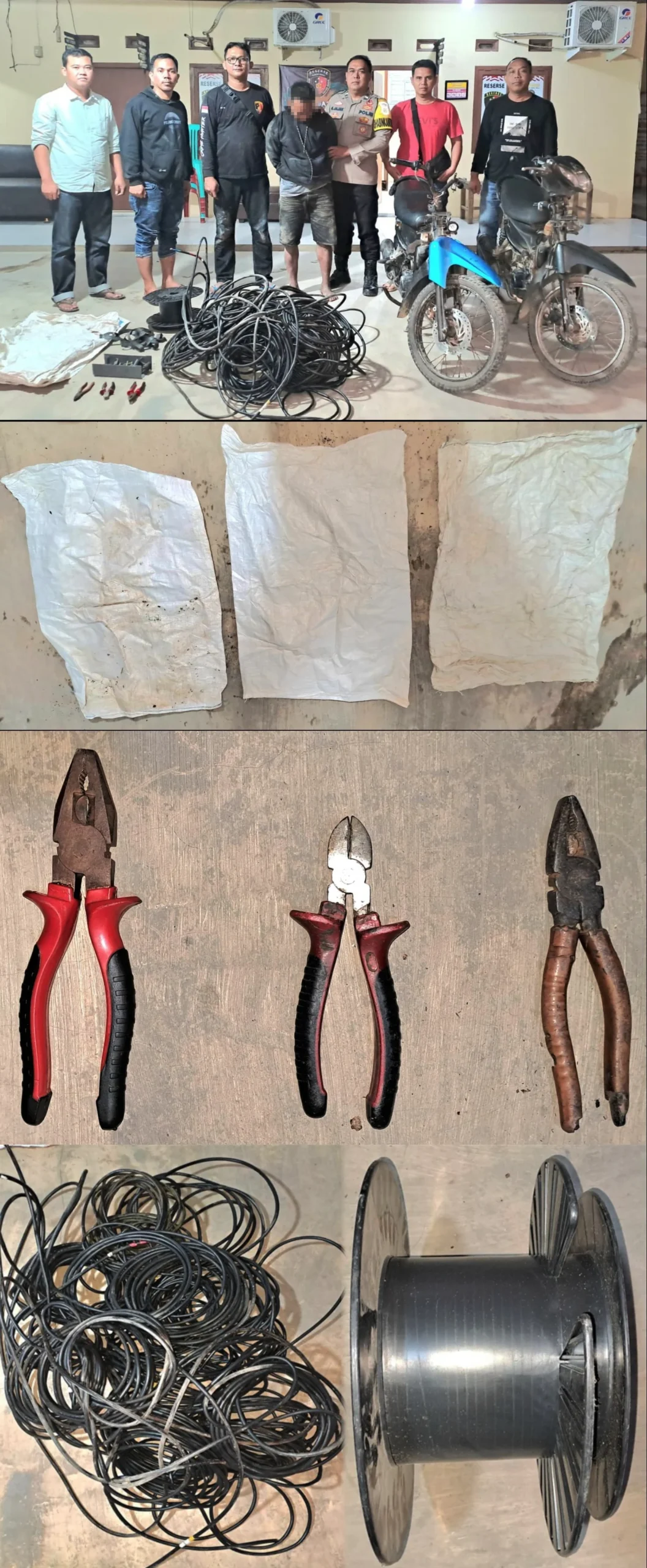 Lanjutnya, adapun barang bukti (BB) yang disita oleh petugas kami dari tangan pelaku curat tersebut yakni 5 (lima) gulung kabel warna hitam dengan panjang sekitar 202 (dua ratus dua) meter, tutup box, 4 (empat) buah klem kabel warna hitam, 3 (tiga) buah karung warna putih, 3 (tiga) unit tang, dan 2 (dua) unit sepeda motor merek Honda Revo warna hitam tanpa plat nomor.