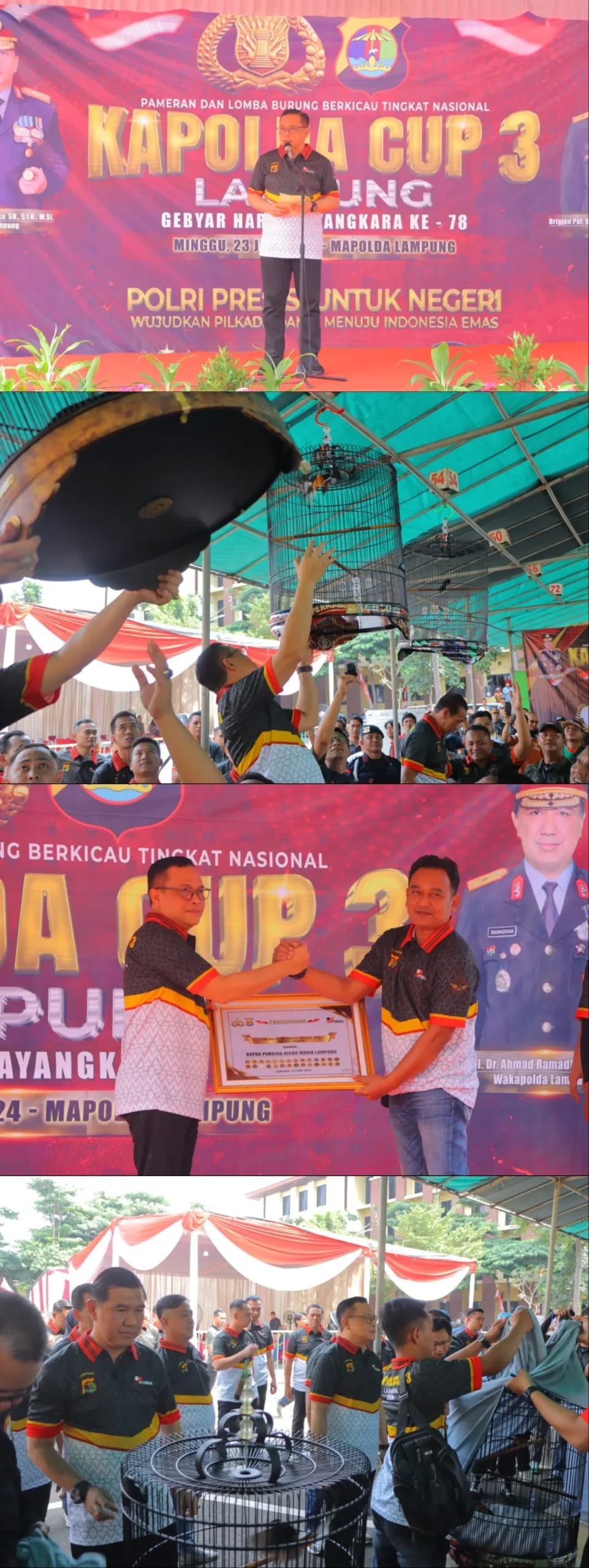 Kapolda Lampung Irjen Pol Helmy Santika S.H ,S.Ik,M.Si., Membuka langsung kegiatan lomba burung berkicau Kapolda Cup III yang dihadiri Wakapolda Lampung dan PJU Polda Lampung.