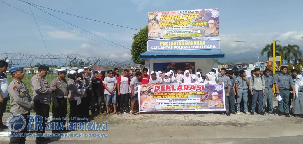 ZR Masamba, Luwu Utara — Dalam upaya meningkatkan kesadaran akan pentingnya mematuhi peraturan lalu lintas dan menjaga lingkungan, SAT LANTAS Luwu Utara menggelar Deklarasi Larangan Penggunaan Knalpot Tidak Sesuai Spesifikasi Teknis. Acara ini digelar serentak di seluruh jajaran Polda Sulsel , mulai pukul 09.00 hingga selesai, di Pos Lantas depan Bandara Tugu Masamba Affair, Kelurahan Bone, Kecamatan Masamba, Kabupaten Luwu Utara.7/2/2024