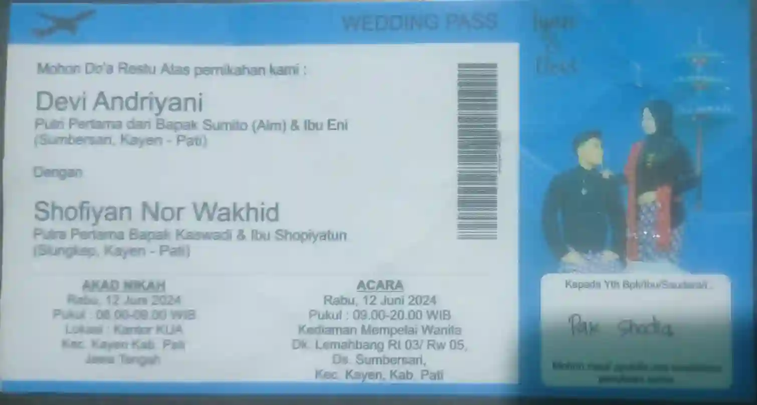 Pasangan yang dimaksud yaitu Devi Andriyani binti Sumito (alm) 20 th. dan Shofiyan nor Wakhid bin Kaswadi 23 th. Pasangan itu menikah di rumah mempelai wanita pukul 08.00 waktu setempat pagi tadi Rabu 12 Juni 2024.