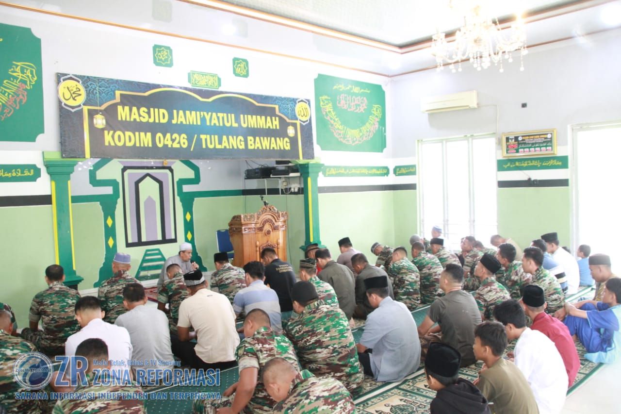 Menggala (Tulang Bawang) — Kodim 0426 Tuba baik TNI maupun PNS yang beragama Islam bersama-sama melaksanakan kegiatan Sholat Jumat Berjamaah di lanjutkan Doa bersama dalam rangka mendukung keselamatan prajurit di manapun berada bertempat di Masjid Jami’yatul Ummah, Jl. Lintas Timur Sumatera, KM. 113 Kampung Bujung Tenuk, Kecamatan Menggala, Kabupaten Tulang Bawang, Jum’at 29 Desember 2023.